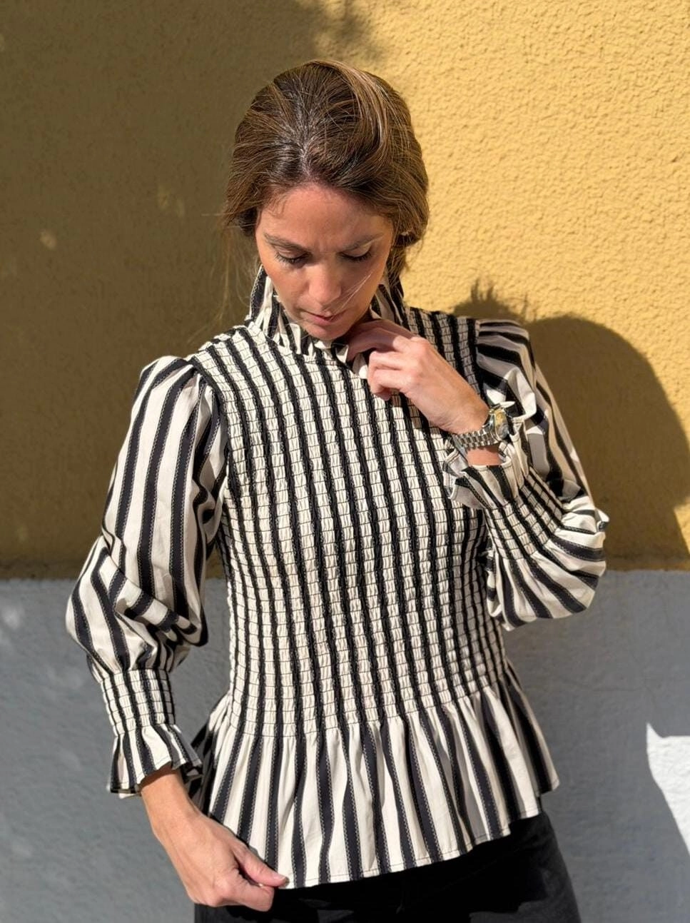 Camisa de rayas en contraste con diseño entallado gracias a su cuerpo fruncido tipo nido de abeja. Destaca por su cuello alto y mangas largas con puños elásticos, aportando un aire sofisticado y actual. Bajo con ligero volante que añade movimiento y feminidad.